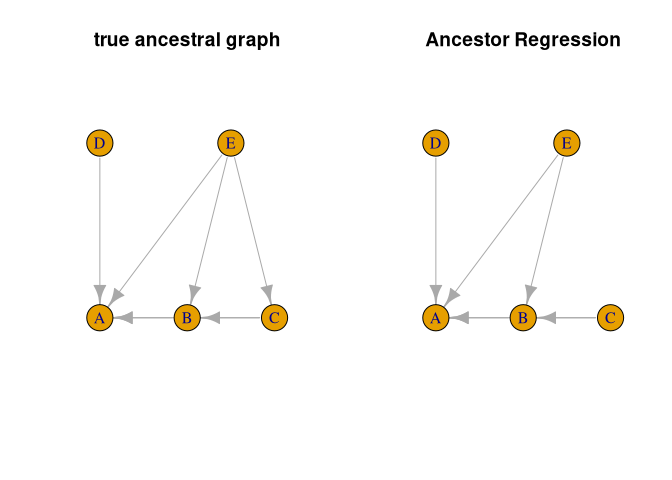 As we know the truth in the simulated model, we can compare the estimated ancestral graph with the true one.