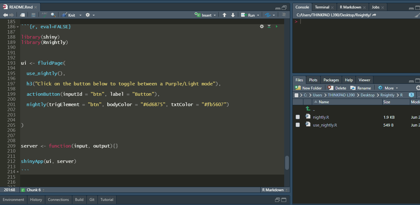 The goal of Rnightly is to implement a Dark/Light toggle mode in your Shiny user interface. You can also change the default behavior by specifying other colors.