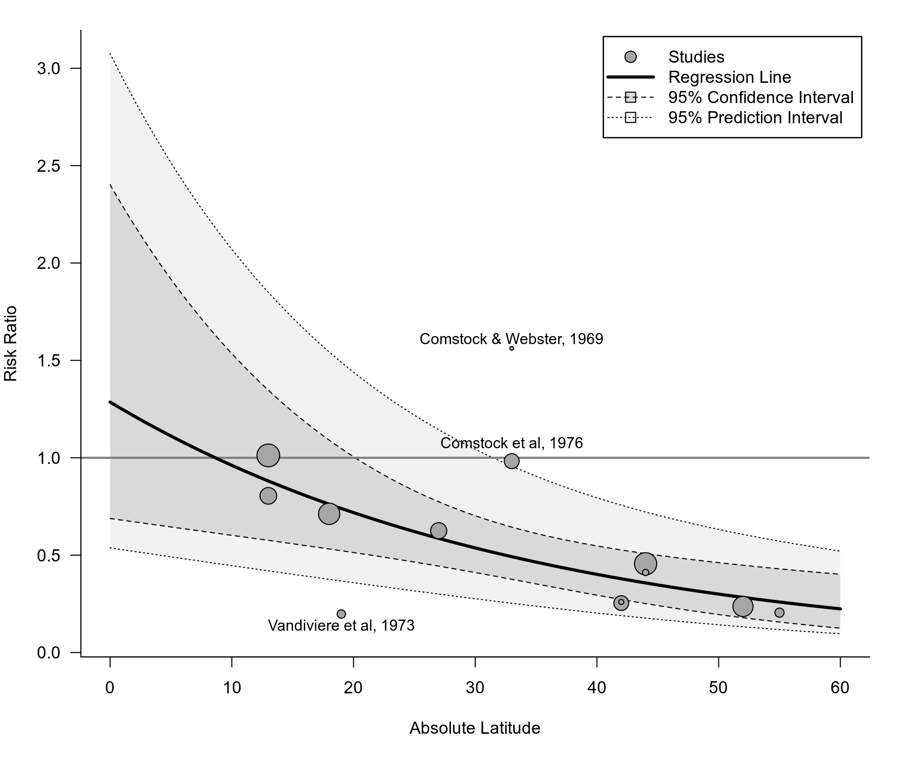 # mixed-effects meta-regression model with absolute latitude as moderator