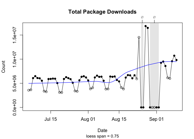 The graph below, which plots the total number of downloads recorded by the Posit/RStudio mirror from Sat 7/05 through Sun 9/14, shows the magnitude of the outliers and the two graphical fixes (open circles are weekends).