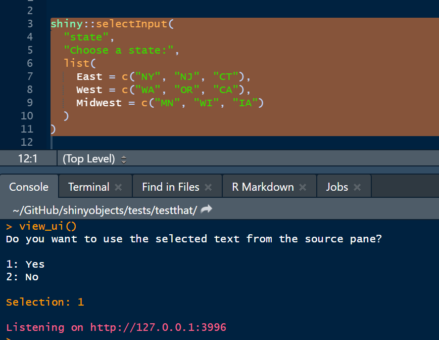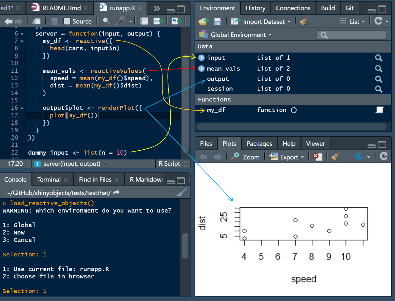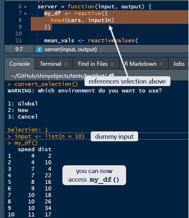 …but in words, the main function of shinyobjects is load_reactive_objects(). It is similar to running source() but with a lot of helpers to give you access to the reactive data. When you run it, your environment will have all your libraries, raw data and assignments, dummy input, output and session lists, and all reactive() assignments will be converted to functions. In the dev version (for 0.2.0), you also get access to your render...() objects in the dummy output list. With the dummy input list and the conversion of reactive(x) to function() x, the code will run your data manipulation referencing your dummy input list and it will be like writing a normal script. Note: shinyobjects does not change your files; the manipulation happens behind the scenes.