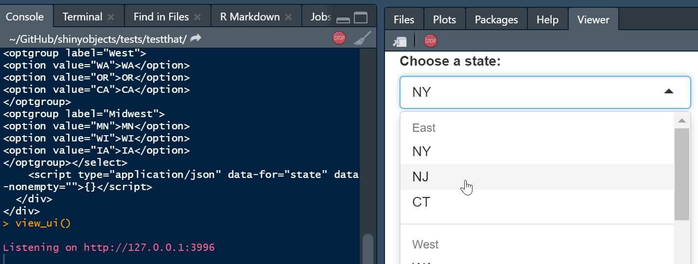 The package converts reactive data frames into functions that will read from your raw data and become available in your environment. The main function, load_reactive_objects(), will recommended that you create a dummy input list in your script to simulate reactive inputs. When you run load_reactive_objects(), it will prepopulate this list. You can learn more about dummy input lists in this vignette. The package also includes a function to view your UI elements in the viewer pane (see below).